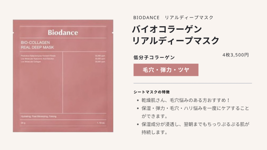 ・1枚で保湿・毛穴・キメ・弾力・ハリにアプローチし、肌悩みを改善してくれます。