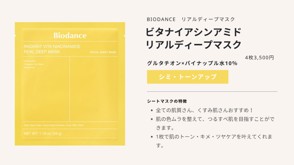 1枚で肌のトーン・キメ・ツヤケアを叶えてくれるシートマスクです。