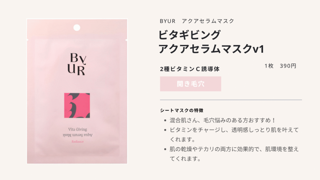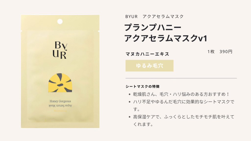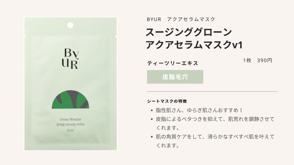 ByuRのアクアセラムマスクは、毛穴管理に美容液をたっぷり含ませているので、素肌の美しさを磨き上げてくれます。