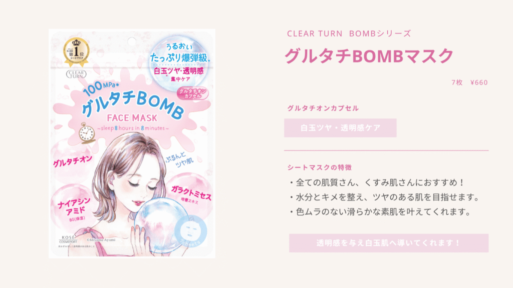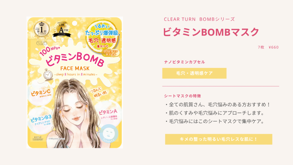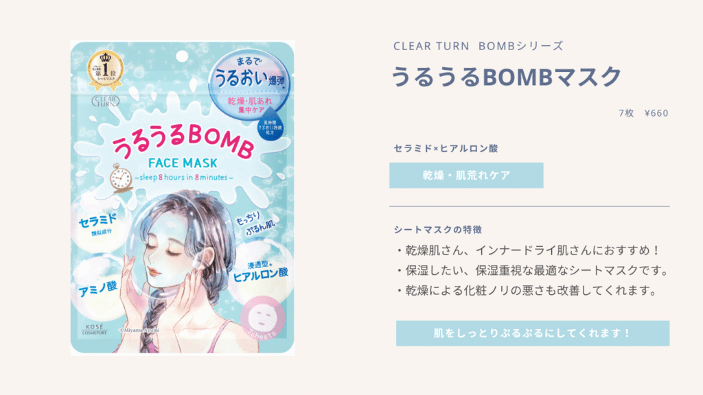 CLERA TURNのBOMBシリーズは、8分の集中ケアで8時間熟睡したような肌へ導いてくれます。