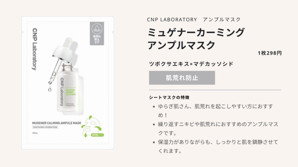 ニキビや赤みにも素早く鎮静してくれるので、救世主アンプルマスクです。