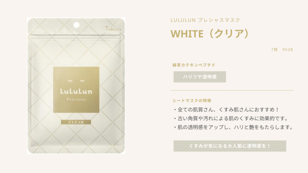 ・年齢による肌のくすみが気になり始めた時に、透明感を与えてくれるシートマスクです。
