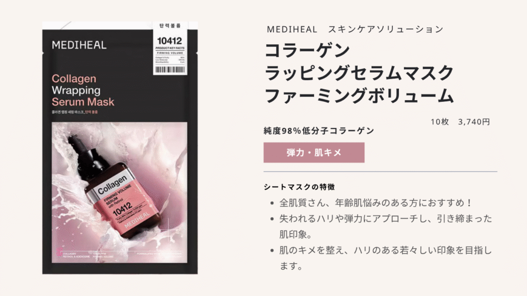 MEDIHEALのスキンケアソリューションマスクは、肌の状態や肌悩みに応じて選ぶことができます。
